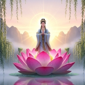 Kuan Yin, auch bekannt als Guanyin oder Quan Yin, ist eine zentrale Figur im Buddhismus und im chinesischen Daoismus. Sie ist der weibliche Bodhisattva des größten Mitgefühls, ähnlich wie Mutter Maria für ihre Barmherzigkeit verehrt wird. Ihr voller Name Kuan Shi Yin Pusa bedeutet wörtlich: